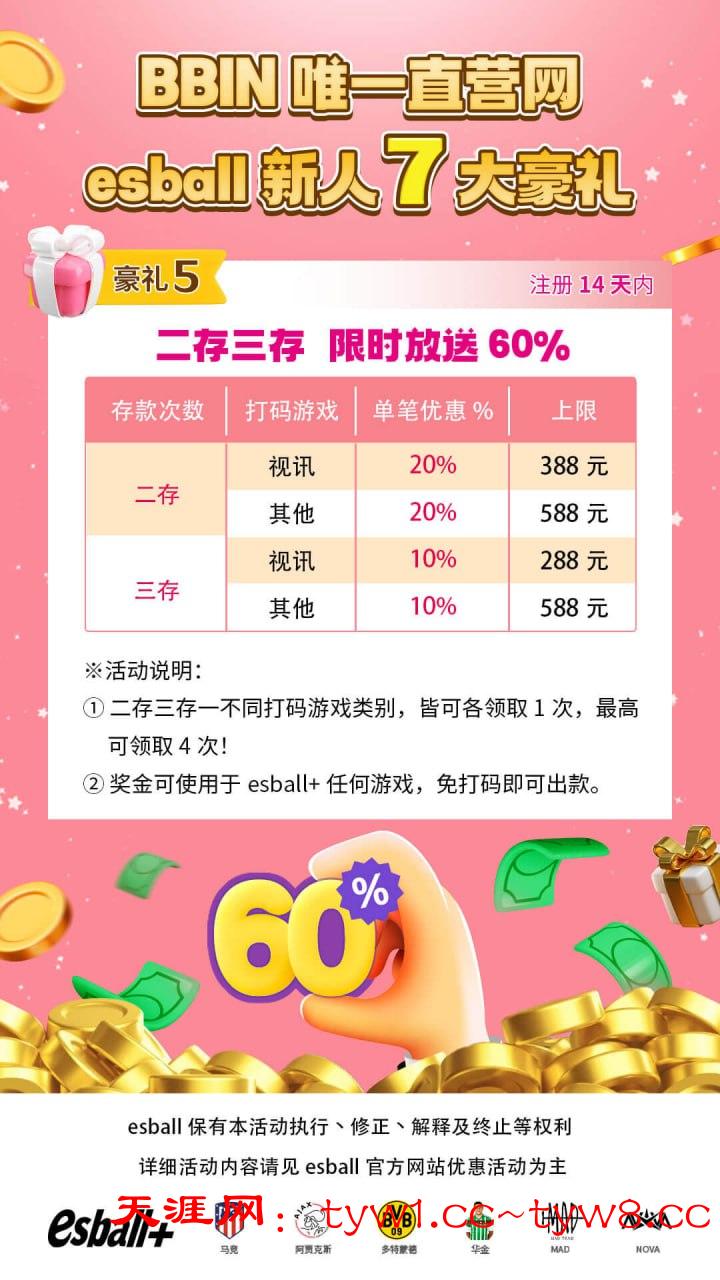 【注册14天内➜二次存款】并完成打水任务,赠您【二存金额20%】,最高可领388+588!