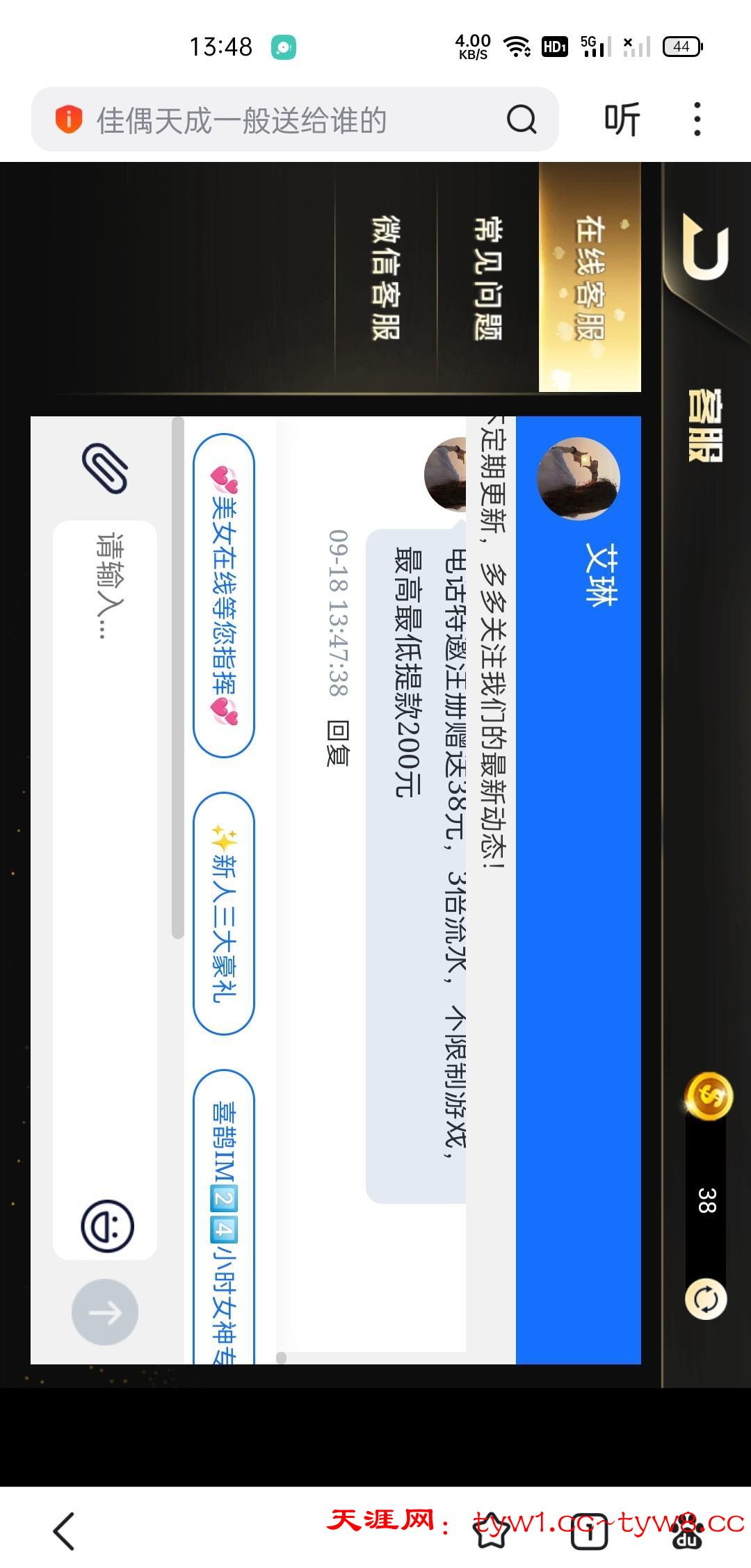 接到电话登录上去显示手机号注册过了,我记得好像以前领过一次38了也没充值过,然后登录上去找在线客服又送了38,没有游戏限制三倍流水,出款自测。