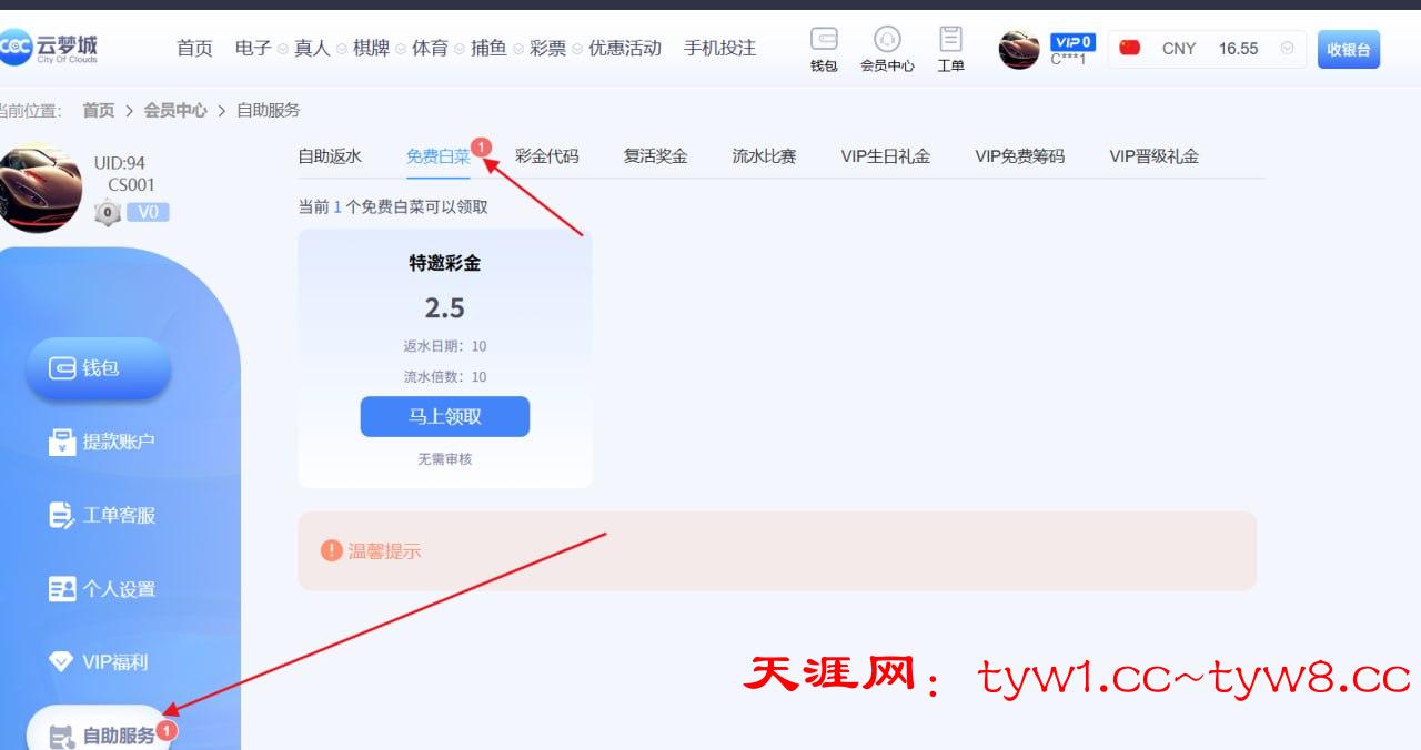 主页点击我的 自助优惠 白菜彩金 里面领取即可!