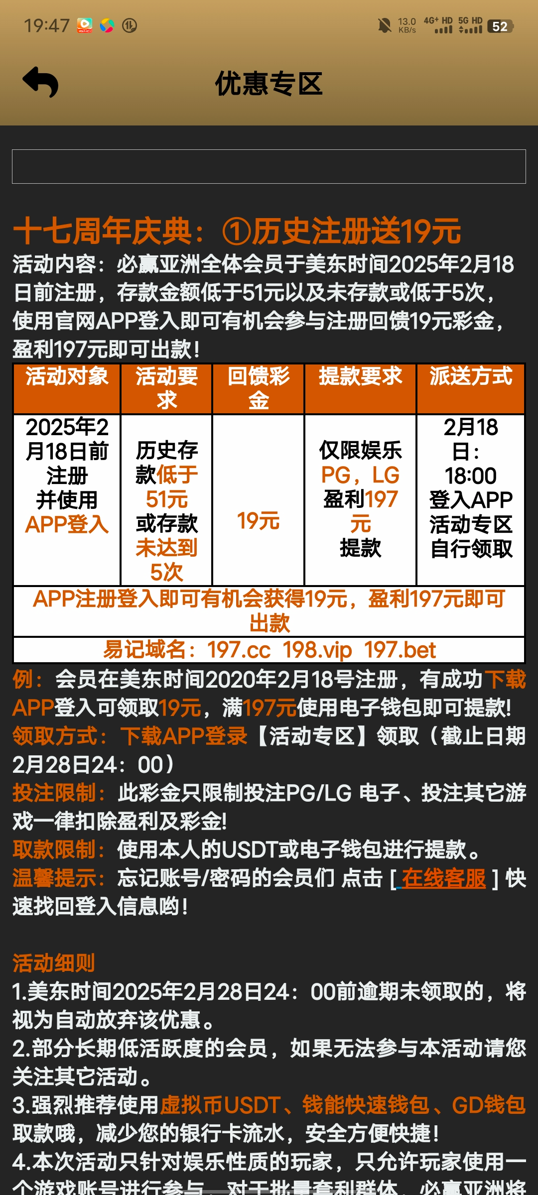 2月18号之前注册就能领19,没注册的今晚12点之前赶紧注册。老用户存款51+且三次加的可以领19+19网址看图,祝各位老哥都能嫖到,成功的老哥下面反馈一下 谢谢