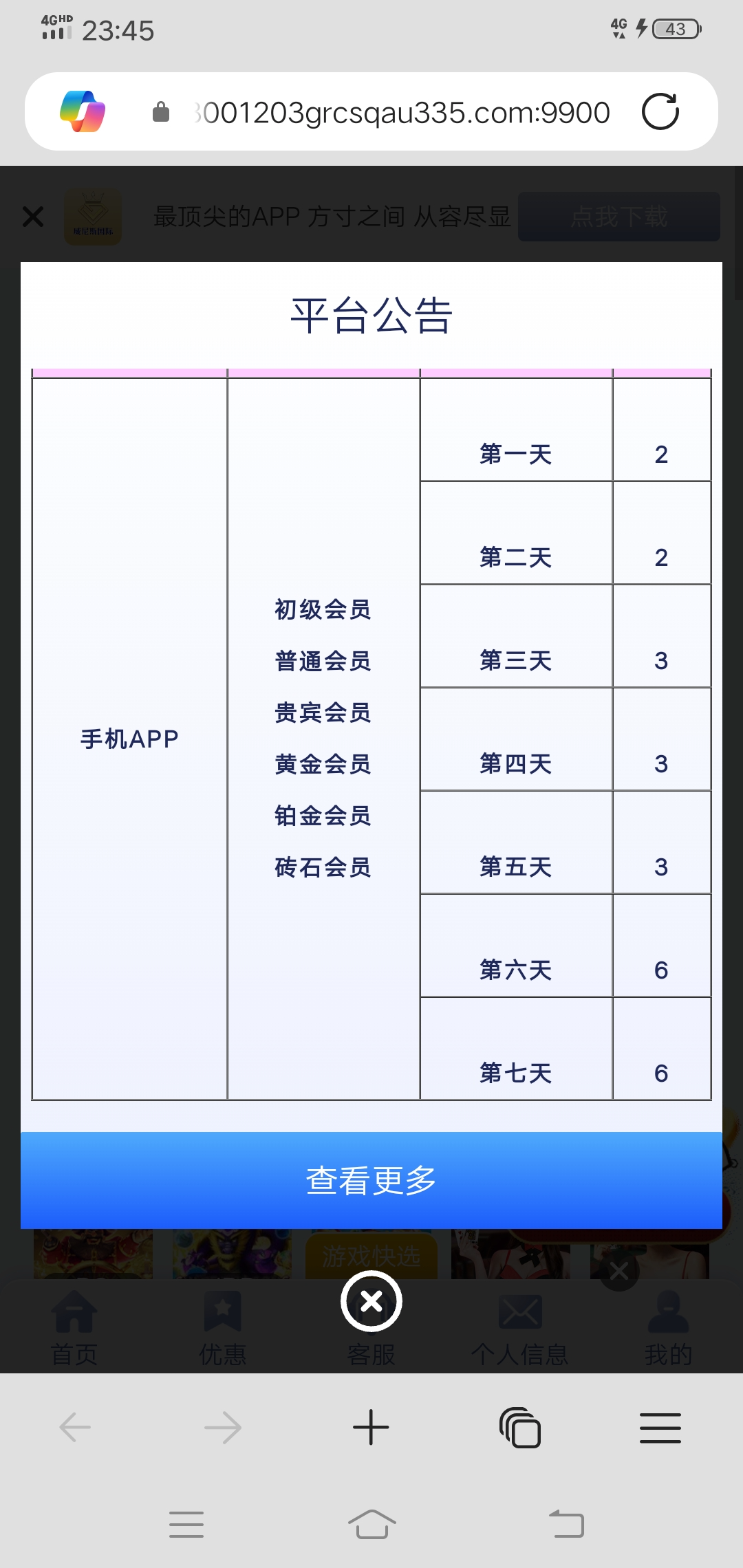 威尼斯国际有免费7天签到彩金活动,不需要充值,需要下载APP连续签到7天,2+2+3+3+3+6+6=25元,