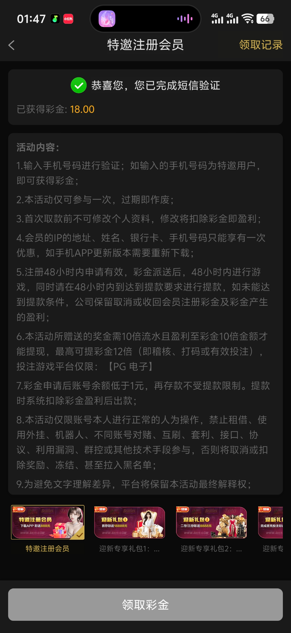 特邀注册送18,需10倍流水且10倍余额,出款最低180,最高216
