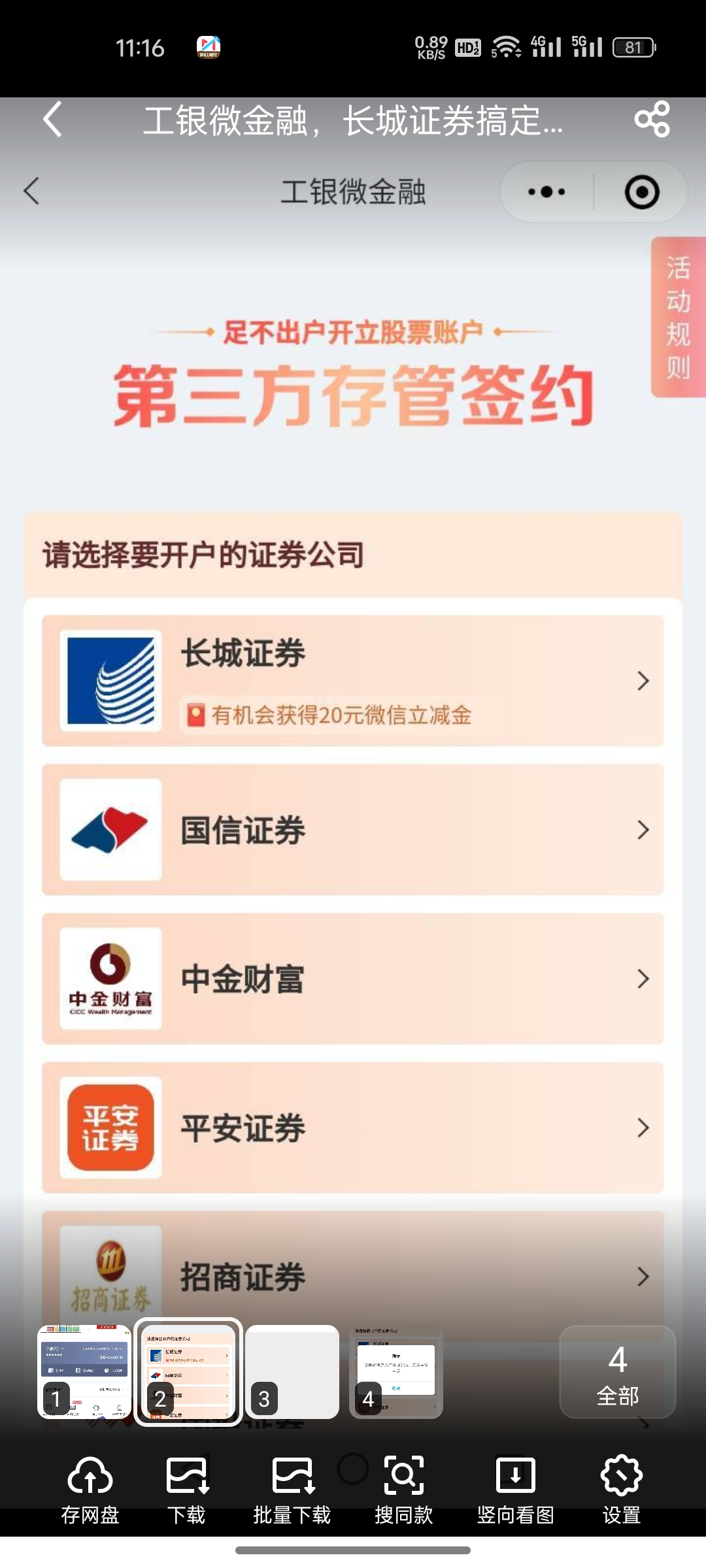 【工银微金融,长城证券搞定。五分钟20毛】