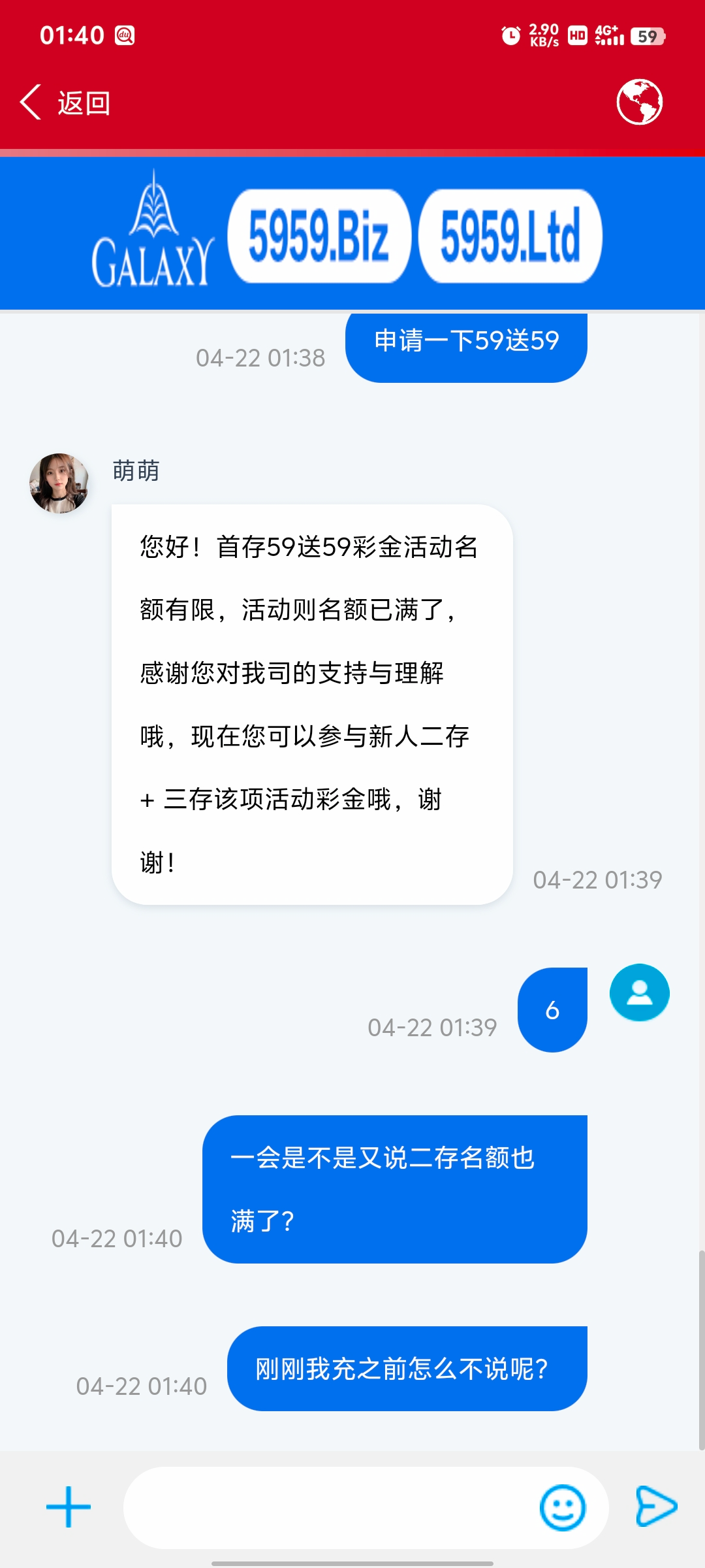 存59打够2倍流水线在线客服领59,必须指定钱包充值才行,本人冲了59成功下500