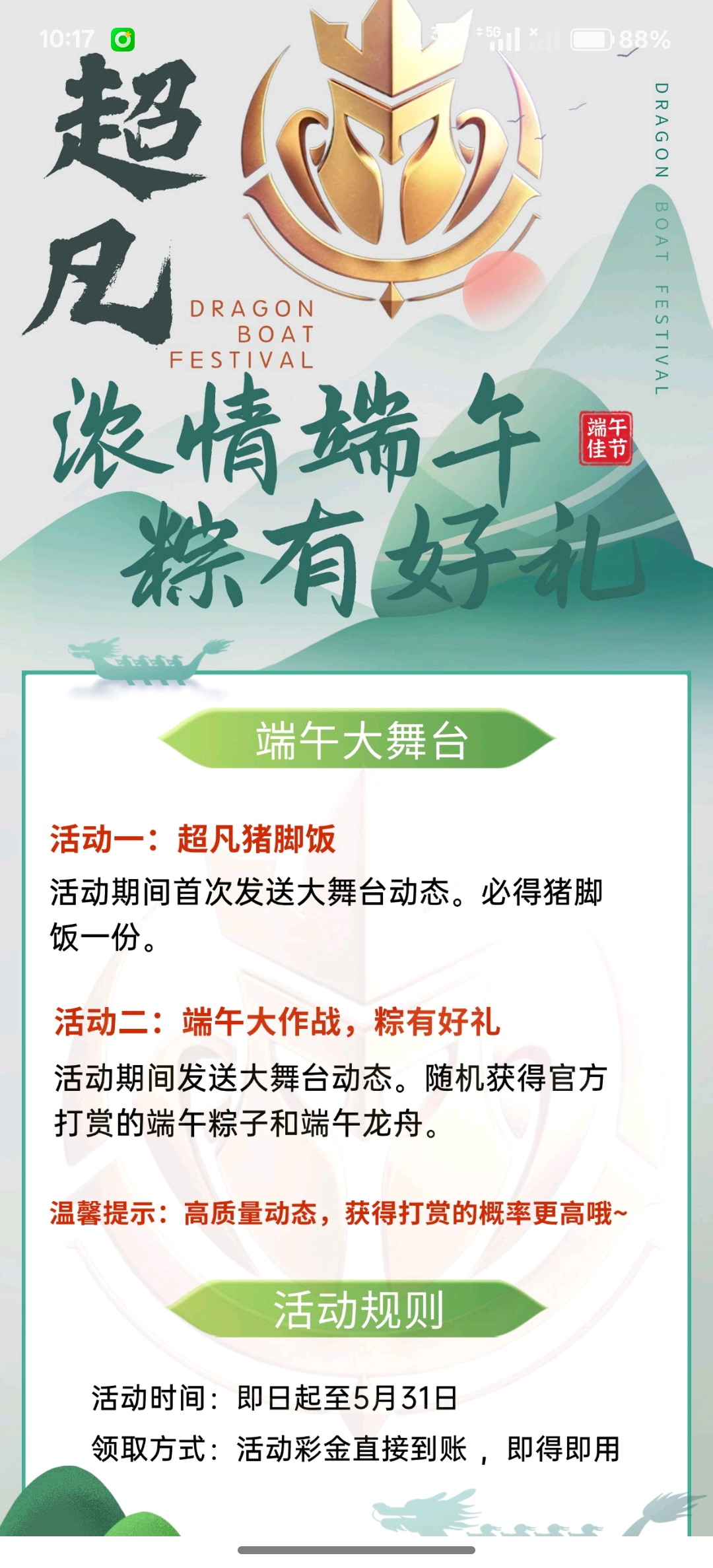 您好,在5月10日至31日期间,您需在24小时内累计充值满200元,即可获取一次发布大舞台的机会哦。