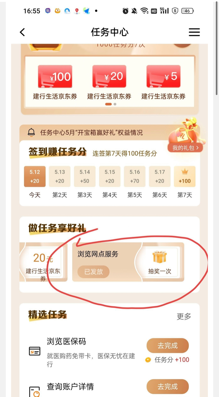 建设银行任务中心这个抽奖 我圈起来了,完成这个浏览任务,直接抽,很多人抽中10立减金,我自己刚中10立减金